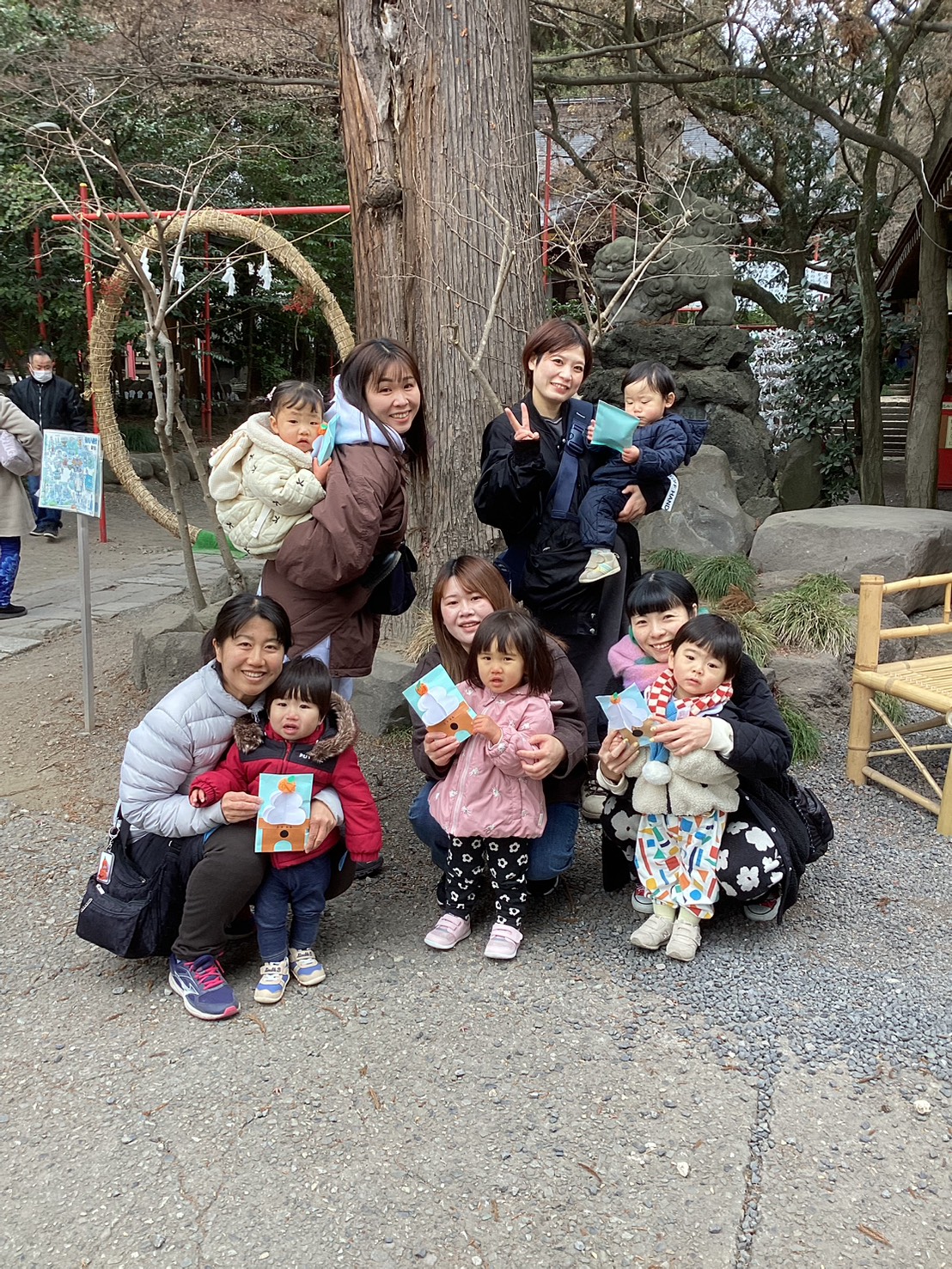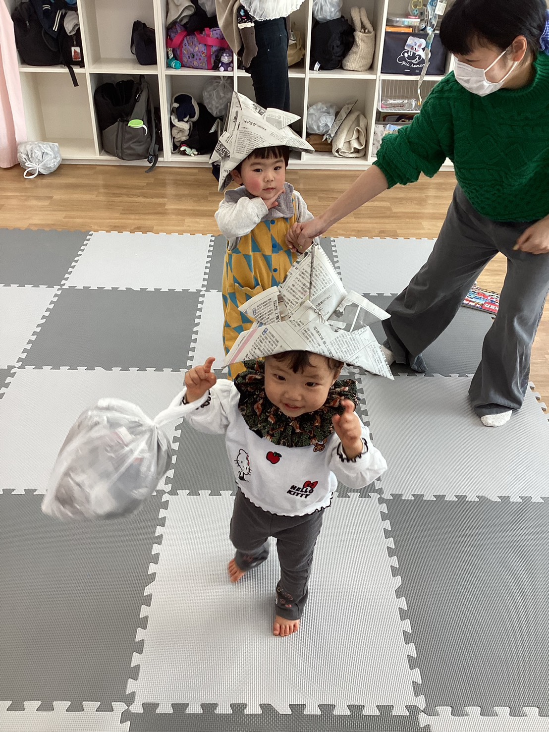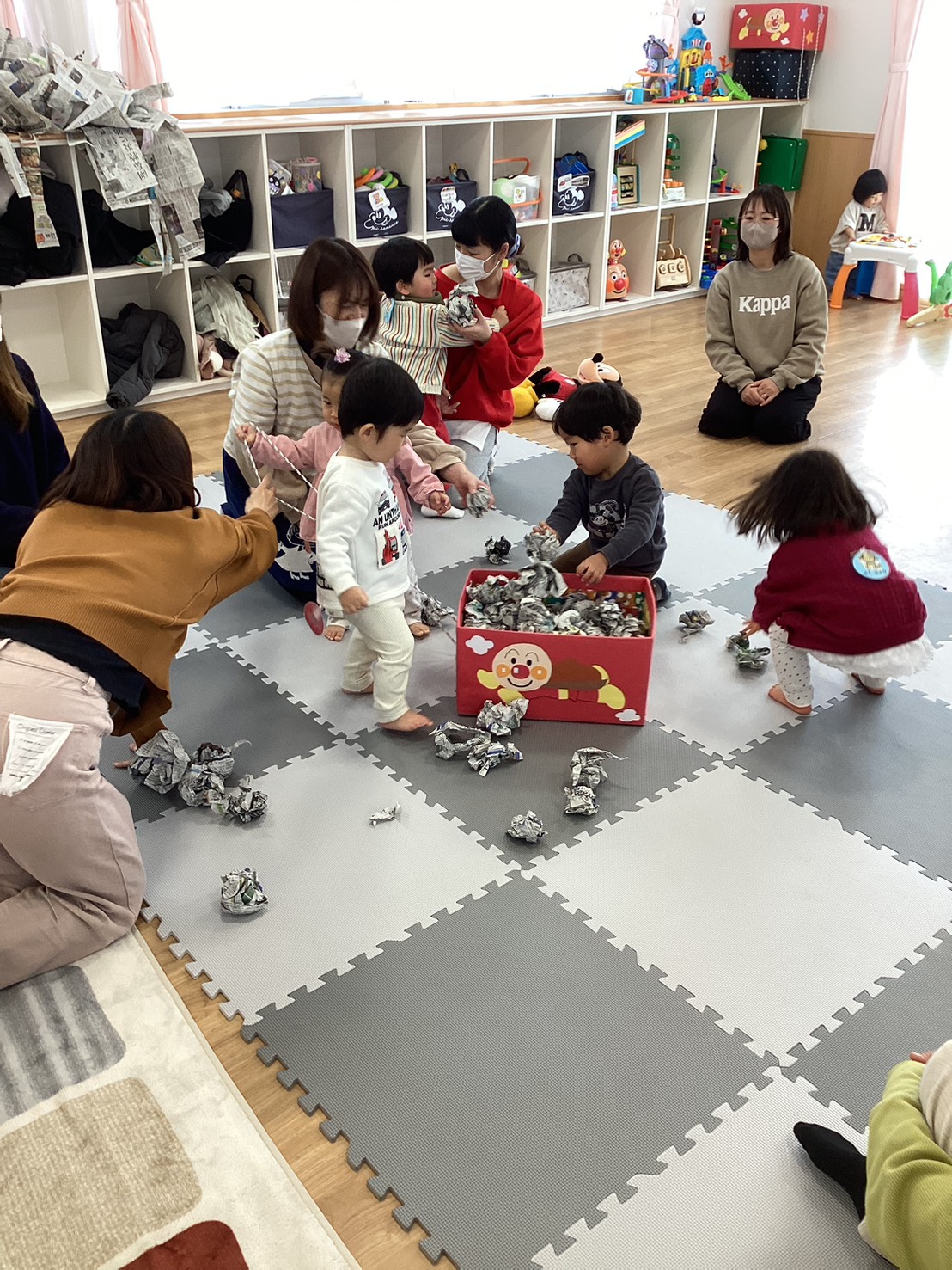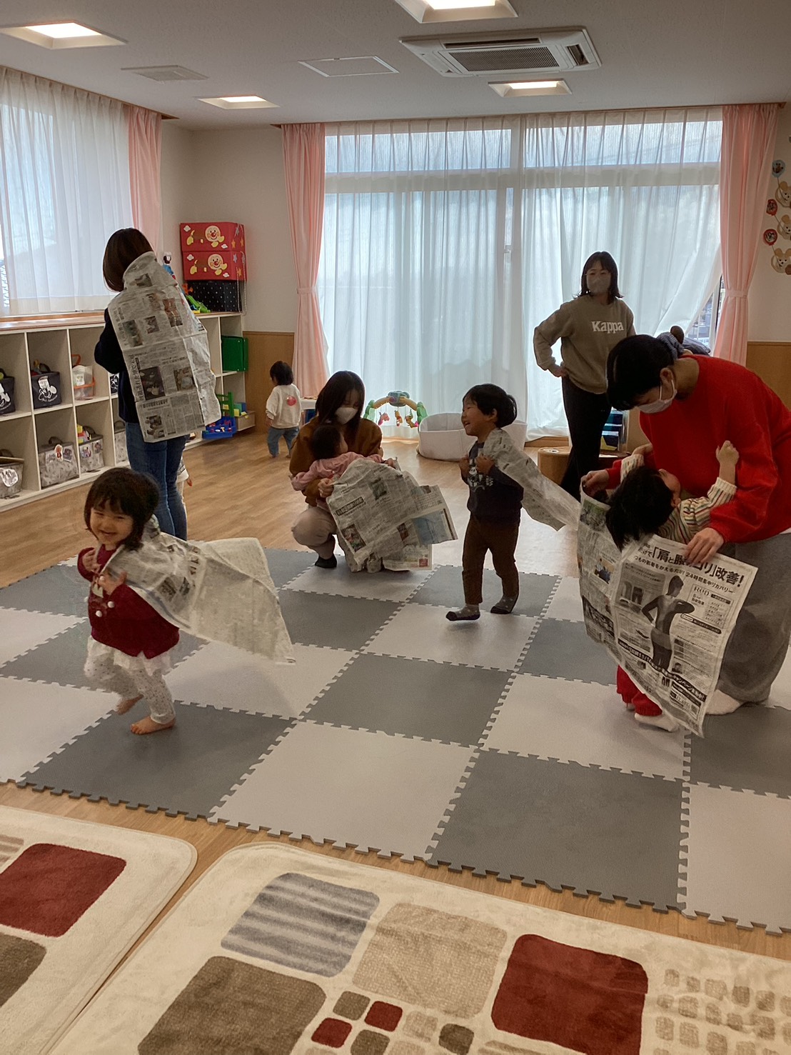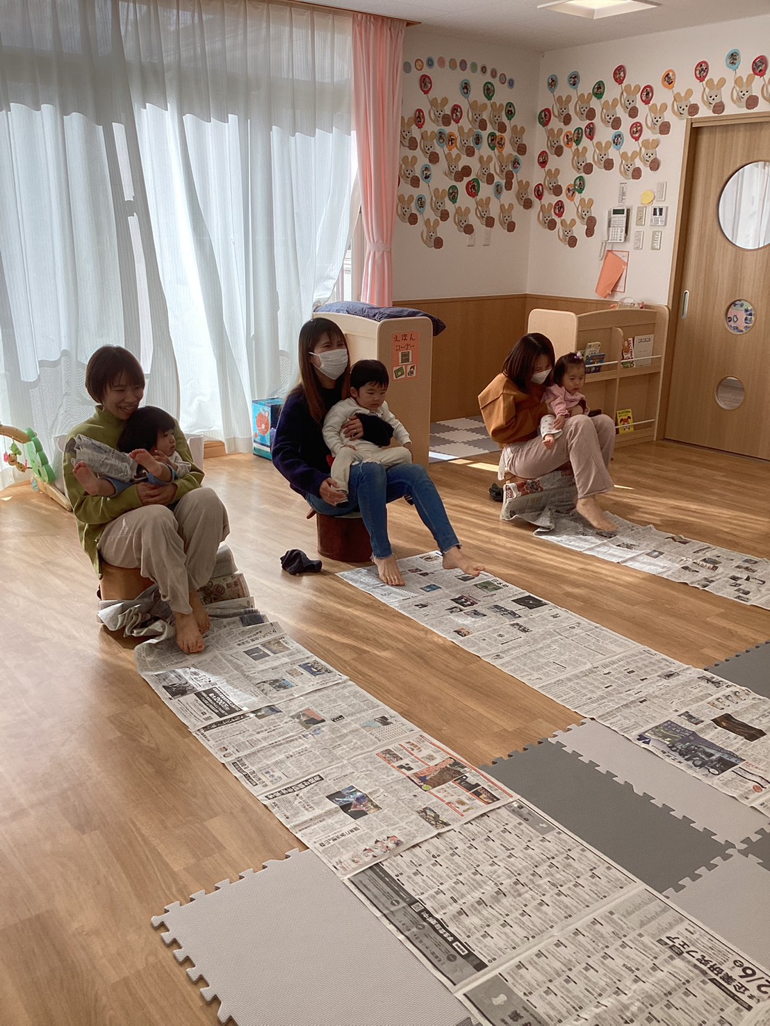 新聞紙を足で引き寄せる競争をしたよ!ママ達がんばれ~